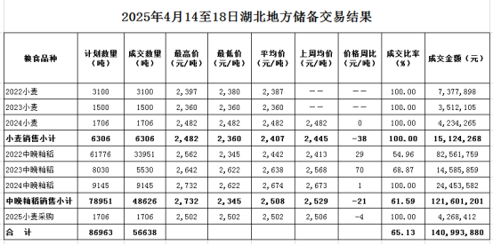 本周湖北地储交易成交各类粮油56638吨。其中销售: 2022年小麦3100吨,全部成交,成交均价2387元/吨;2023年小麦1500吨,全部成交,成交均价2360元/吨;2024年小麦1706吨,全部成交,成交均价2482元/吨;2022年中晚籼稻33951吨,成交率54.96%,成交均价2442元/吨,环比上涨29元/吨;2023年中晚籼稻5530吨,成交率68.87%,成交均价2638元/吨,环比上涨70元/吨;2024年中晚籼稻9145吨,全部成交,成交均价2674元/吨,环比上涨1元/吨。双向竞购采购2025年1706吨,全部成交,成交均价2502元/吨。